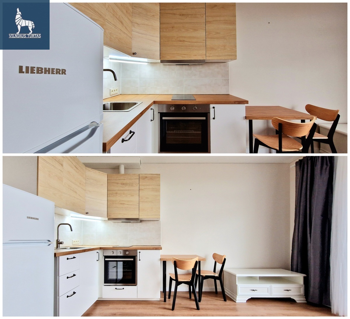 • Pilnai įrengta virtuvė: indukcinė kaitlentė, orkaitė, šaldytuvas