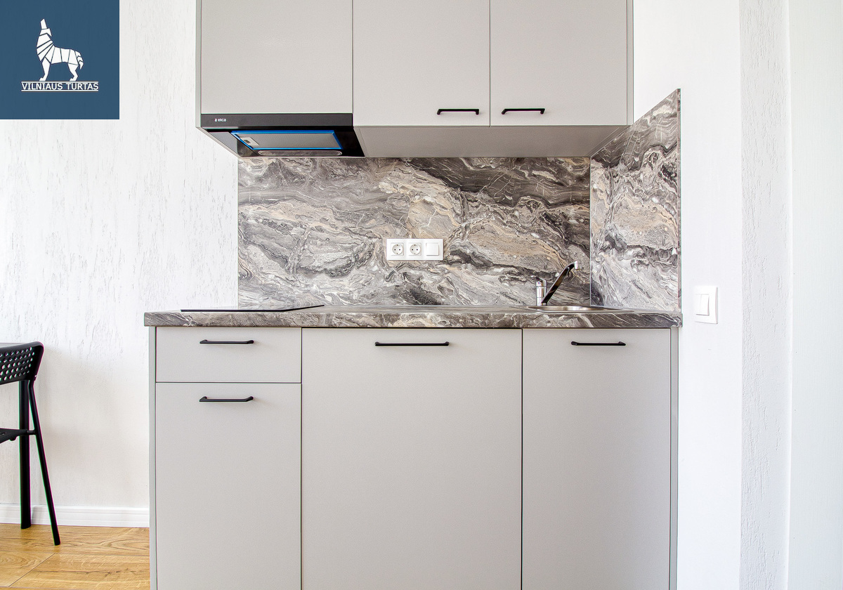 – Virtuvė su elektrine virykle, gartraukiu ir šaldytuvu;