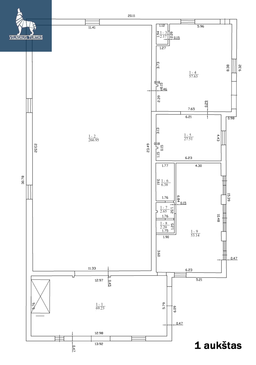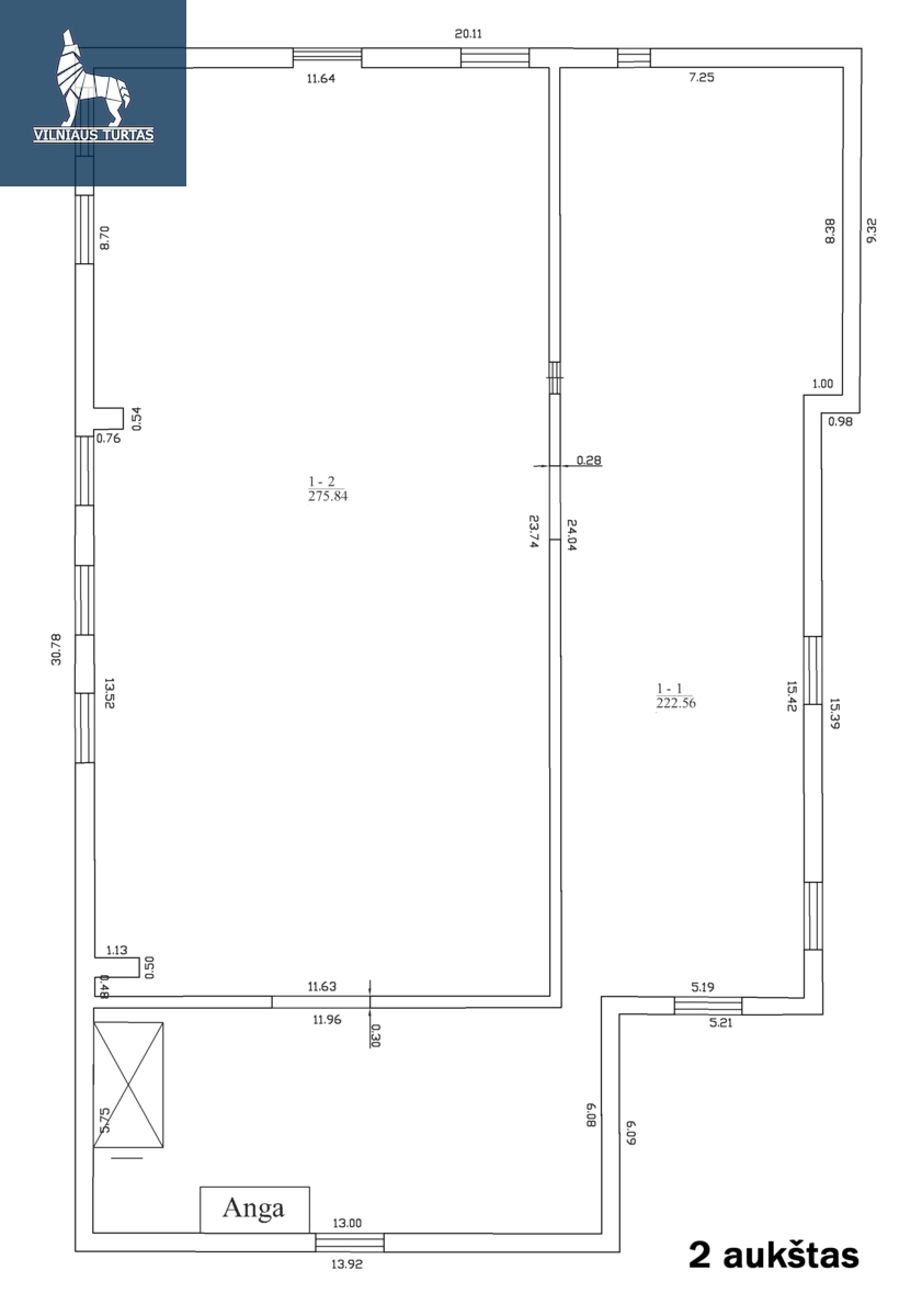 – Bendras plotas: 986,26 kv.m. (1 aukštas: 487,86 kv.m; 2 aukštas: 498,4 kv.m);